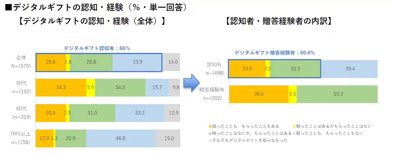デジタルギフトは全体の86.0%が認知。認知者ベースでの贈答経験のある人は60.6%。そのうち「贈ったことはないが、もらったことはある」は33.5%、「贈ったことはあるがもらったことはない」3.2%、「贈ったことももらったこともある」は23.9%だった。 |
