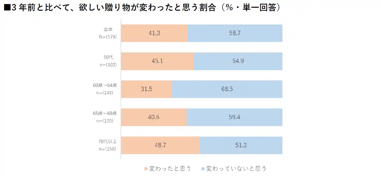 なお、3年前と比較し、「贈り物として欲しいものの内容は変わった」との回答が各年代4割前後みられた。 |