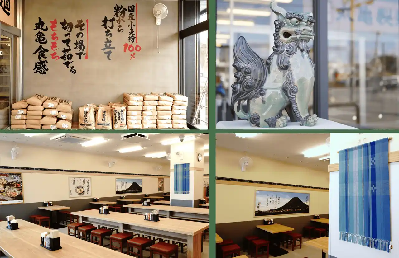 石垣島店は、製麺所ならではの風情感を残しつつも、この土地ならではの文化を取り入れました。まずは、入り口では1対のシーサーがお出迎え。そこから中に入ると、厨房で職人が粉からうどんを打ち、切って、茹でるといった一連の製麺や手づくりの調理を行う厨房が目の前に広がります。客席には、地元の織職人がこのために制作した手織りの22メートルにも及ぶ石垣島の伝統織物「八重山ミンサー織り」が壁に飾られています。他にも、「八重山ミンサー織り」のタペストリーや民芸品を展示しています。 |