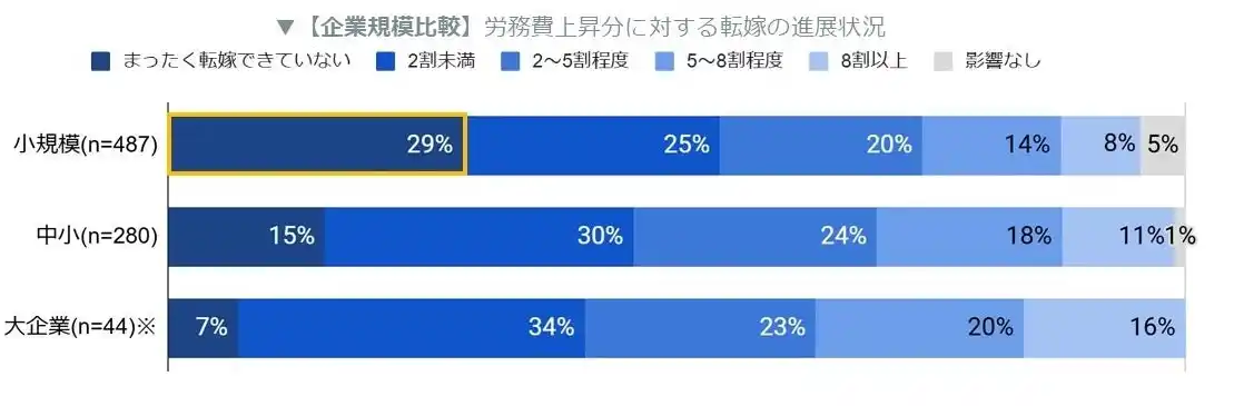 企業規模別に分析したところ、小規模企業では約3社に1社が「まったく転嫁できていない」と回答しており、企業規模が小さいほど影響が顕著です。 |