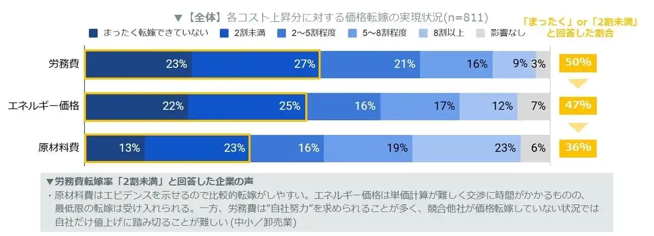 原材料費やエネルギー価格に比べ、労務費は最も価格転嫁が困難であることが明らかになりました。 |
