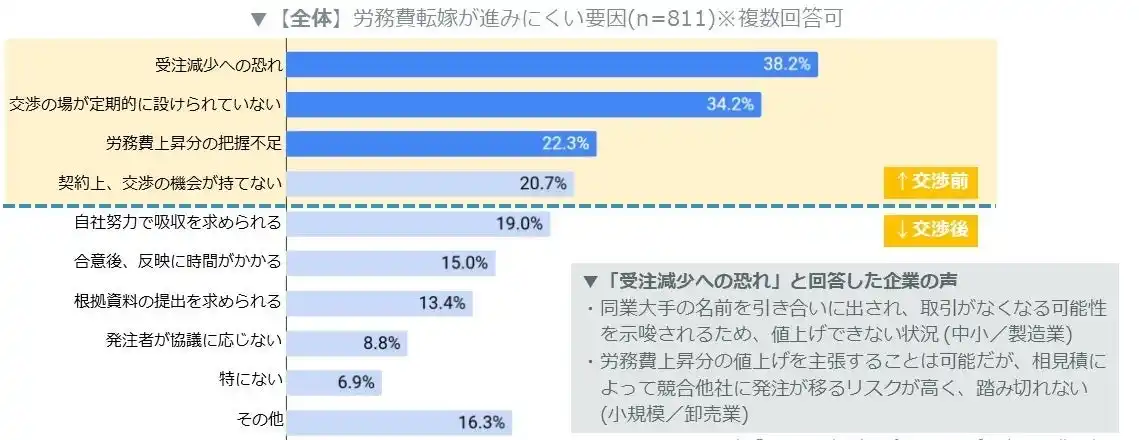 労務費転嫁が進まない要因として最も多かったのは、「受注減少への恐れ」でした。 |