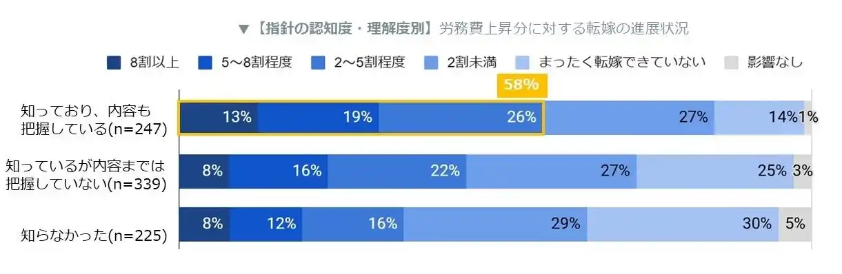 さらに、指針の内容を理解している企業ほど、労務費転嫁が進んでいる傾向が確認され、制度の“理解”が“実践”につながっていないことが大きな課題として浮き彫りになりました。 |