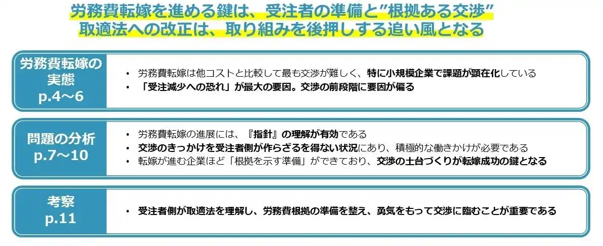 一方、労務費を他のコストと切り分け根拠を示せている企業ほど転嫁が進んでいることから、各種の公表資料(春闘、最低賃金改定など)を活用して根拠を示すことで、交渉が前進する可能性が高いことも明らかになりました。 |