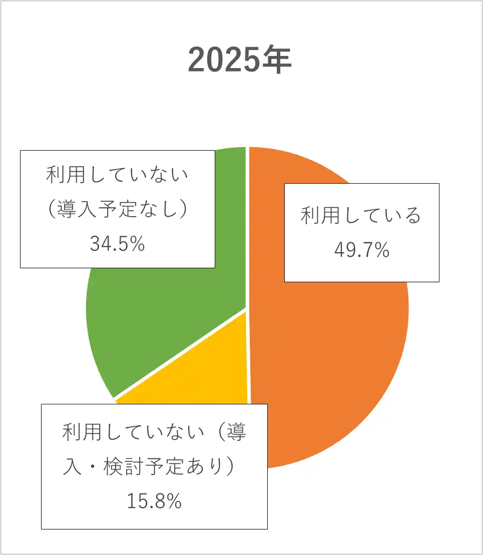 生成AIツールの利用率は、前回の調査(2024年)では35.6%だったのに対し、今回の調査では49.7%と、直近1年で約14ポイント増加し、約半数の企業が生成AIツールを利用していることがわかりました。また、「現在利用していないが、今後導入・検討予定あり」と回答した企業は15.8%で、昨年の5.9%に対して約10ポイント増加しました。この成長は、日常業務において生成AIツールの実用性が高まっていることを示しています。 |