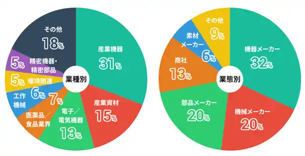 *MRC導入企業の業態・業種割合 機械、機器、部品メーカを中心に、産業機器や電気/電子、医薬品、食料品までの幅広い製造業のBtoB企業様にご利用いただいております。 |