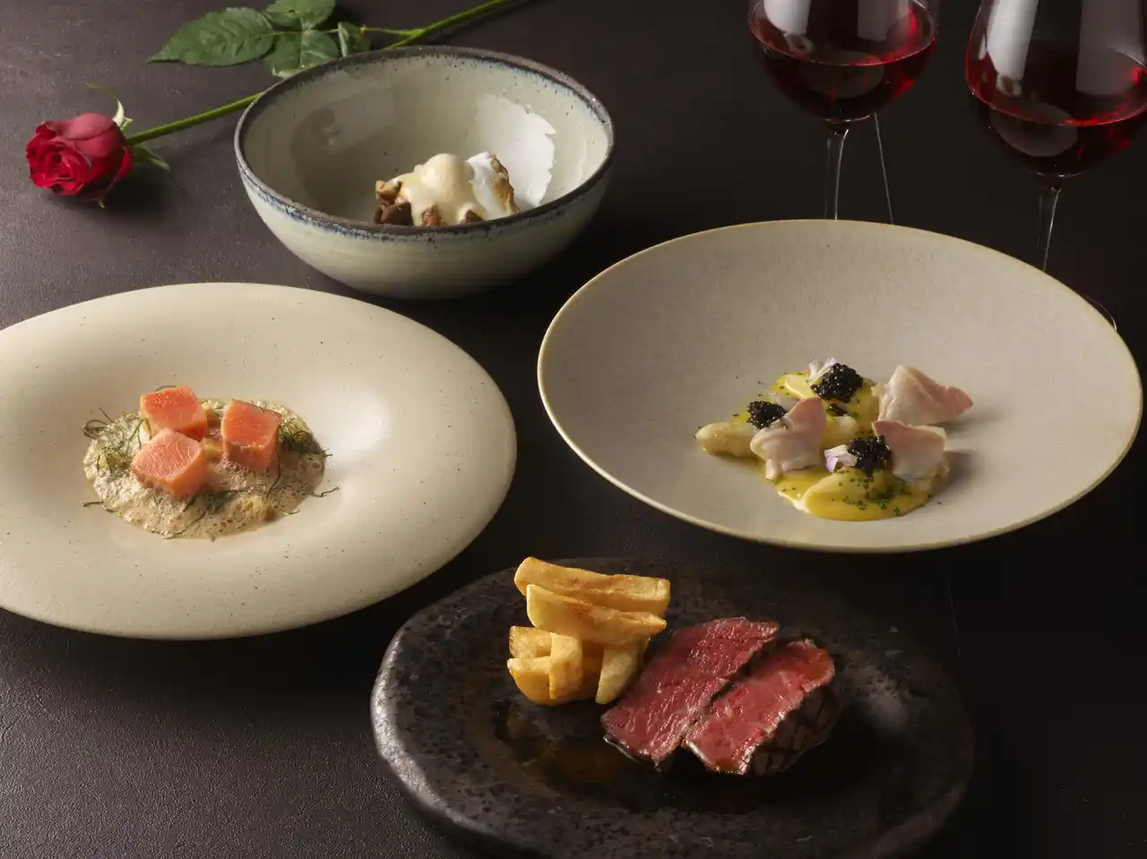コースは、はまぐりとキャビアを組み合わせた華やかな一皿からスタートし、香り豊かなフォアグラのガナッシュへと続きます。薪火グリルで香ばしく焼き上げるアイアン・ベイ自慢の紅富士サーモン、そしてメインの国産牛は、素材そのものの旨みを存分に引き出し、特別な日のディナーをより印象深いものへと昇華させます。 |