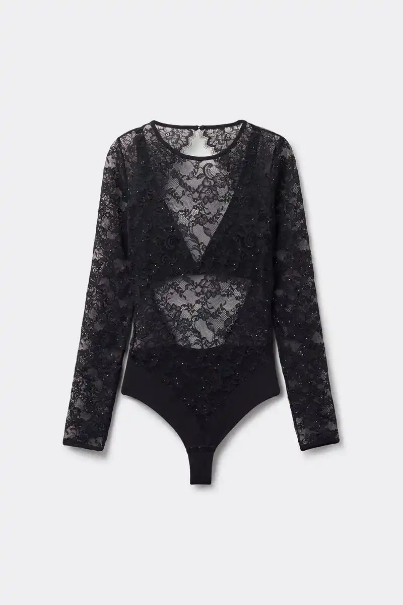 背中が開いたデザインのレース製のボディスーツ。歩くたびにミニスパンコールが輝きを放ちます。内側には、モダール製の取り外し可能なトライアングルブラが付いています。柔らかなモダールのパーツで着心地よく仕上げたセンシュアルな一着です。 |
