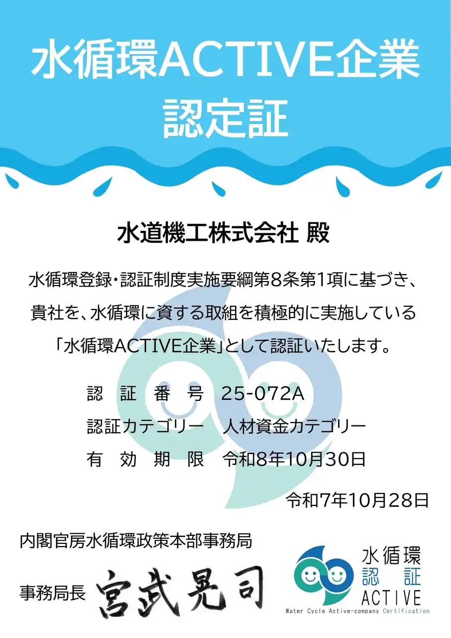 上下水道施設及び環境保全・衛生施設の設計・施工・管理を主な事業として展開する、水道機工株式会社(本社:東京都世田谷区、代表取締役社長:古川 徹、以下「水道機工」)は、この度、内閣官房水循環政策本部から水循環企業登録・認証制度実施要綱第8条第1項に基づき、令和7年度審査の結果、水循環ACTIVE企業の認証をいただきました。「災害への備え・協力」「社外への水循環に係る教育・啓発」などの取組を評価いただき、昨年に続き、2度目の認定となります。 |