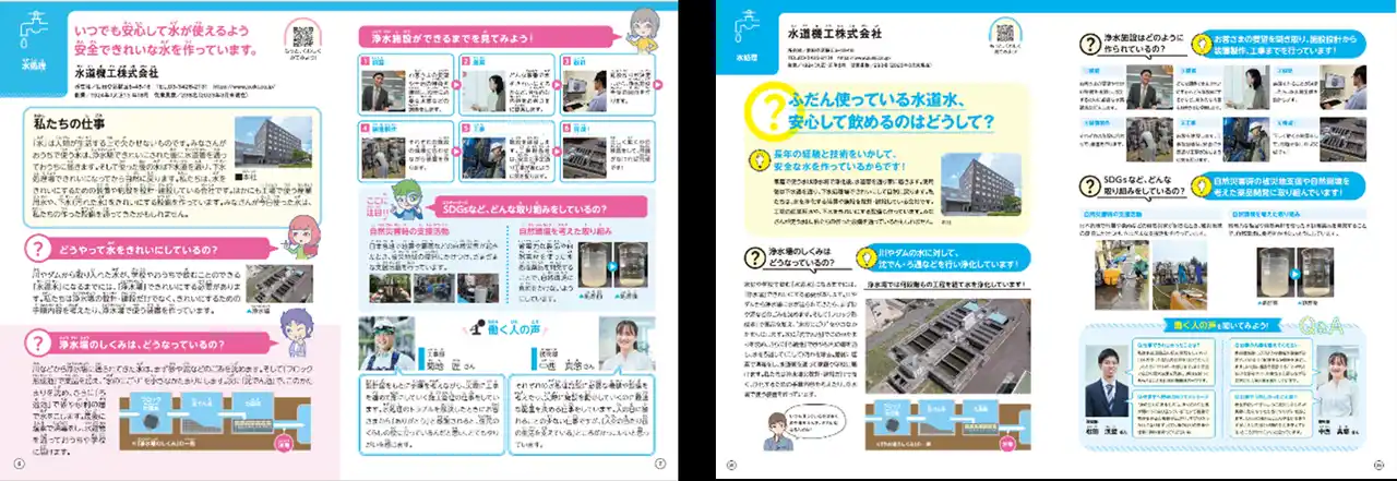 小中学生に向けた仕事紹介冊子に自社記事を掲載・配布することで、「水の循環」にかかわる企業があることを知ってもらい、自分たちが毎日飲んでいる水が、どのような仕組みで自分のもとに届いているのかを伝える啓発活動を行っています。 |