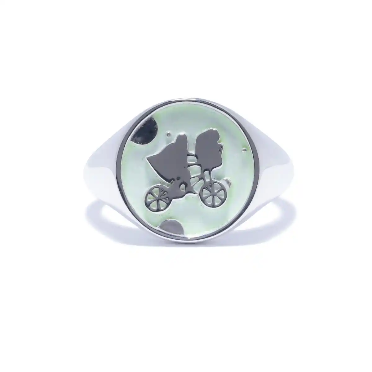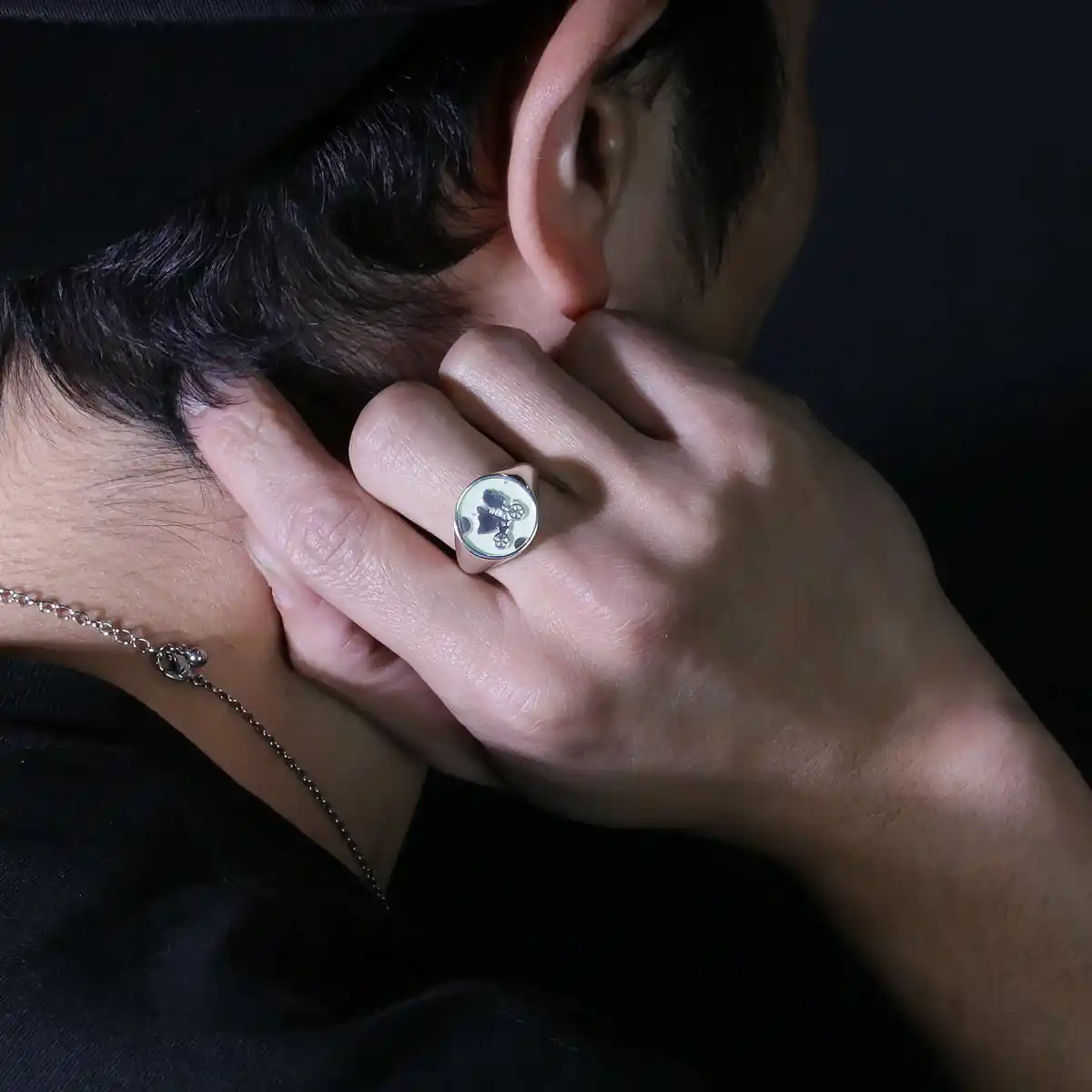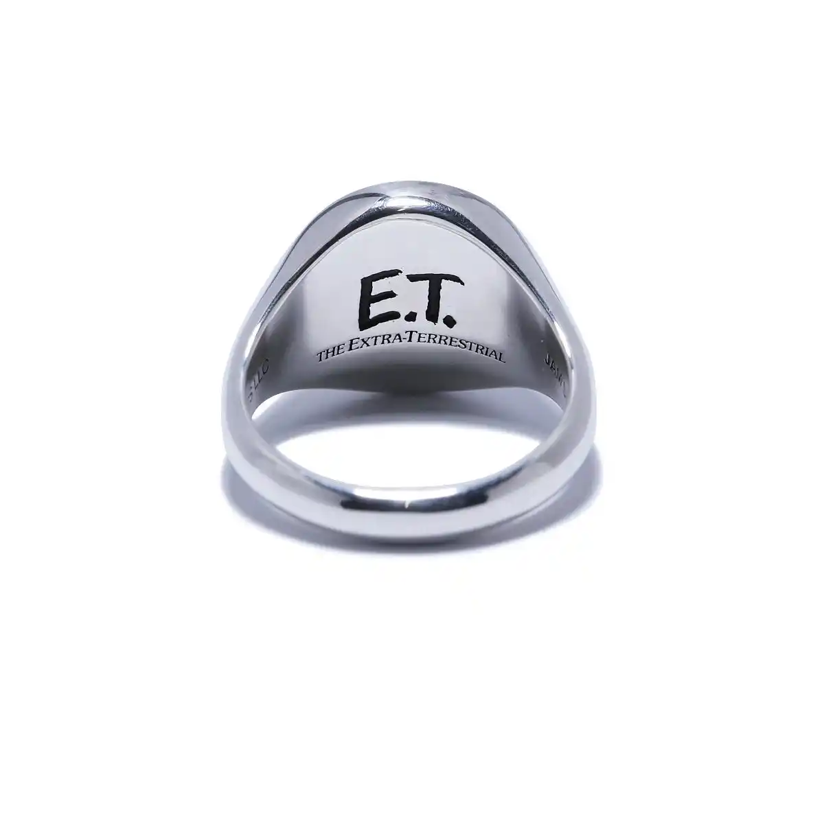 シルバー925の指輪とネックレスに蓄光塗料のギミックを仕込み、裏面にタイトルロゴを彫刻し、コンセプトとユーモアを潜ませています。Tシャツは蓄光プリントを施し、吸収した光は暗闇の中で〈E.T.〉たちを浮き上がらせます。 |