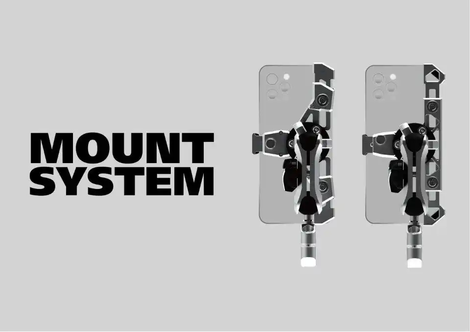 高強度オートバイ用スマートフォンホルダー「MOUNT SYSTEM」。 タフで、強く、美しい。研ぎ澄まされた機能美を持つ、「アルミ削り出し」オートバイ専用スマートフォンホルダー。 |