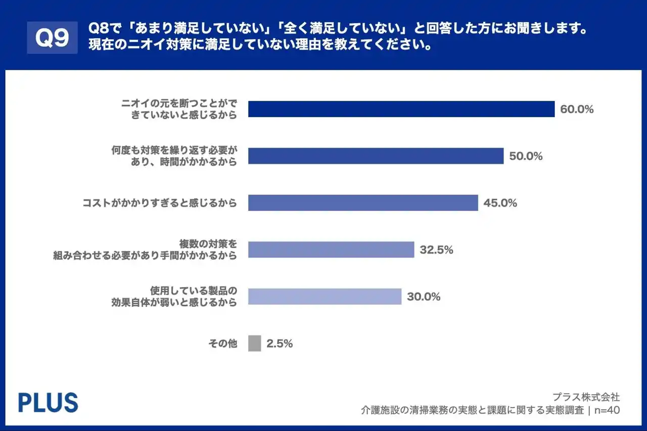 「Q9. Q8で「あまり満足していない」「全く満足していない」と回答した方にお聞きします。現在のニオイ対策に満足していない理由を教えてください。(複数回答)」(n=40)と質問したところ、「ニオイの元を断つことができていないと感じるから」が60.0%、「何度も対策を繰り返す必要があり、時間がかかるから」が50.0%、「コストがかかりすぎると感じるから」が45.0%という回答となりました。 |