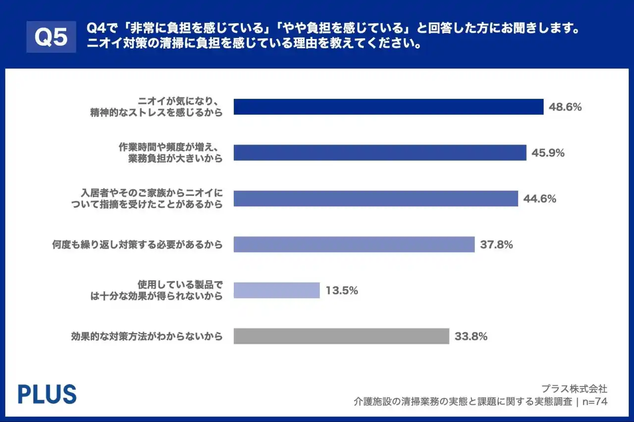 「Q5. Q4で「非常に負担を感じている」「やや負担を感じている」と回答した方にお聞きします。ニオイ対策の清掃に負担を感じている理由を教えてください。(複数回答)」(n=74)と質問したところ、「ニオイが気になり、精神的なストレスを感じるから」が48.6%、「作業時間や頻度が増え、業務負担が大きいから」が45.9%、「入居者やそのご家族からニオイについて指摘を受けたことがあるから」が44.6%という回答となりました。 |