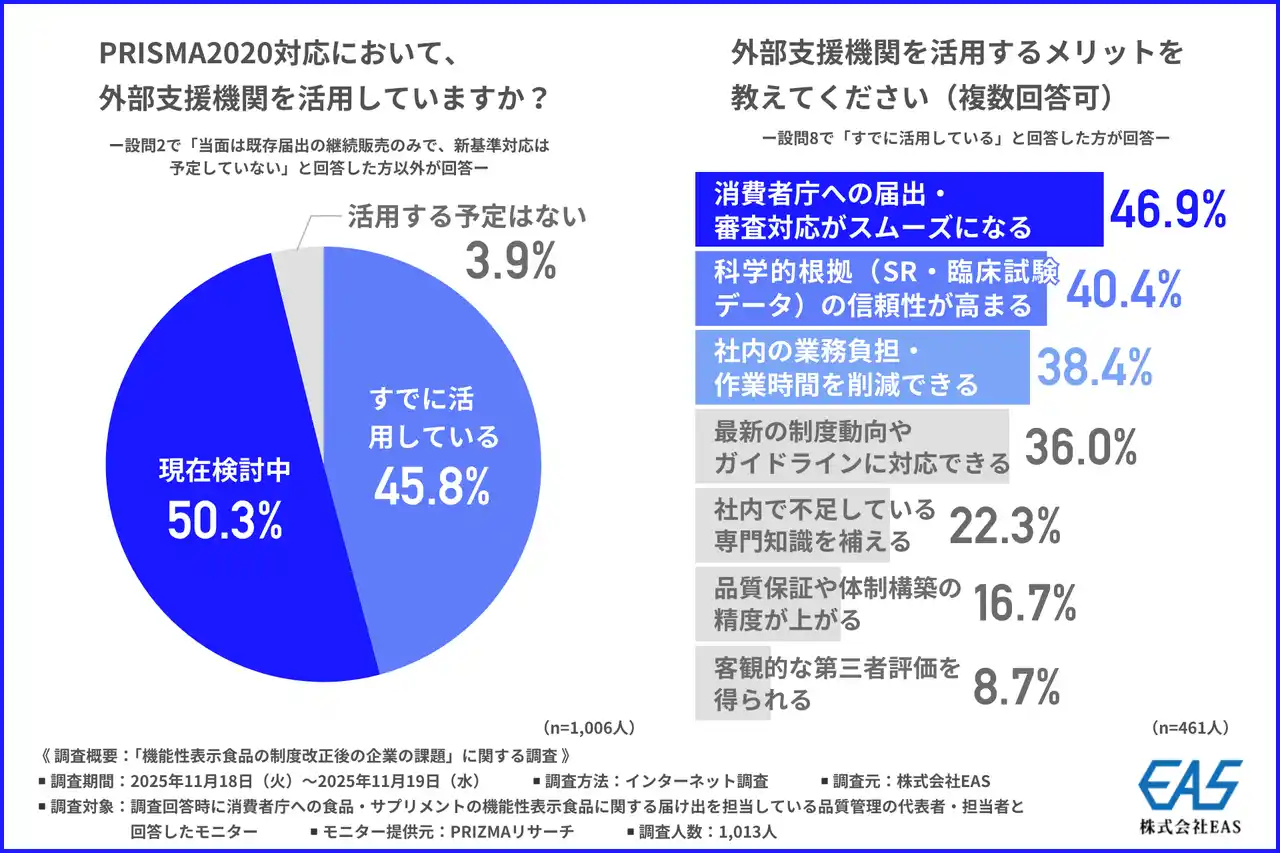 株式会社EAS(本社所在地:神奈川県横浜市、代表取締役:二分 茂礼)は、消費者庁への食品・サプリメントの機能性表示食品に関する届け出を担当している品質管理の代表者・担当者を対象に、「機能性表示食品の制度改正後の企業の課題」に関する調査を行いました。