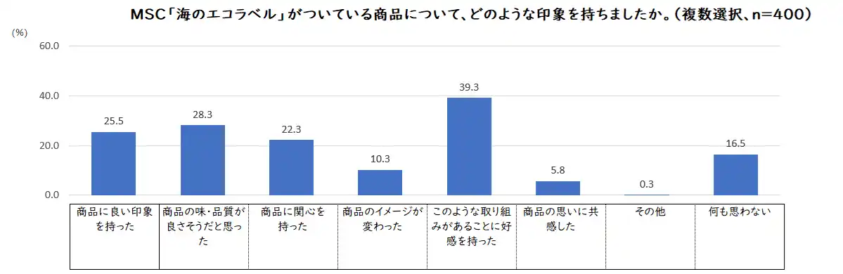 MSCラベル付き商品の例として8点(※)を提示したところ、39.3%が「このような取り組みがあることに好感を持った」、次いで28.3%が「商品の味・品質が良さそうだと思った」と回答しました。 |