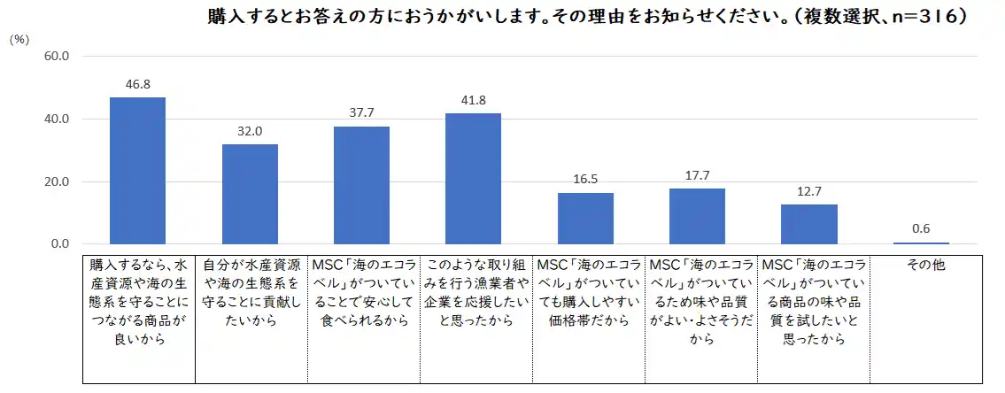 MSC「海のエコラベル」付き商品を購入したいかどうかという質問については、全体の8割近くが「購入した・購入したい」と答えました。その理由は、「水産資源や海の生態系を守ることにつながる商品が良いから」が46.8%、「このような取り組みを行う漁業者や企業を応援したいと思ったから」が41.8%でした。一方で、「購入しない」とした2割の回答者のうち38.1%が、「ふだん購入するお店で目にしないから」とし、次いで36.9%が「購入するかは味や品質次第だから」と答えました。 |