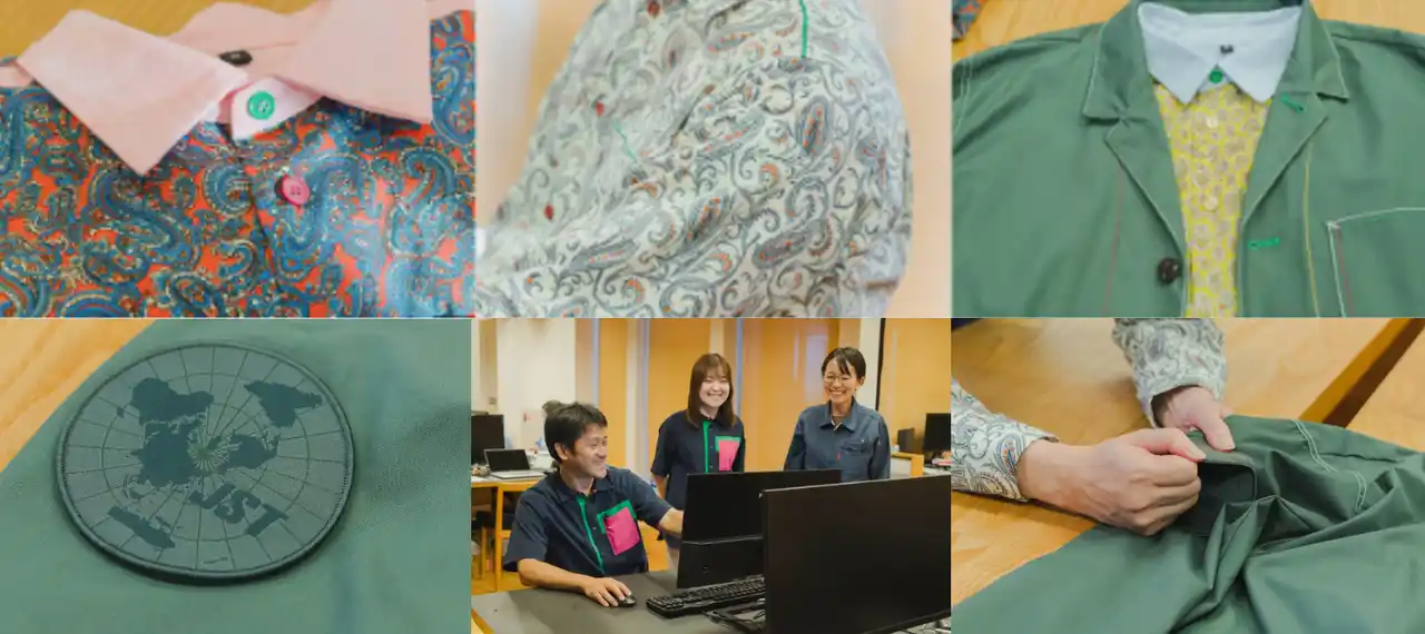 今回、半袖と長袖シャツ、ジャケットを制作しました。性別や年齢、部署など関係なく着用できるデザインにしたいという考えのもと、生地やステッチ、ボタンの素材や色合いなど細部までこだわって作られています。 |
