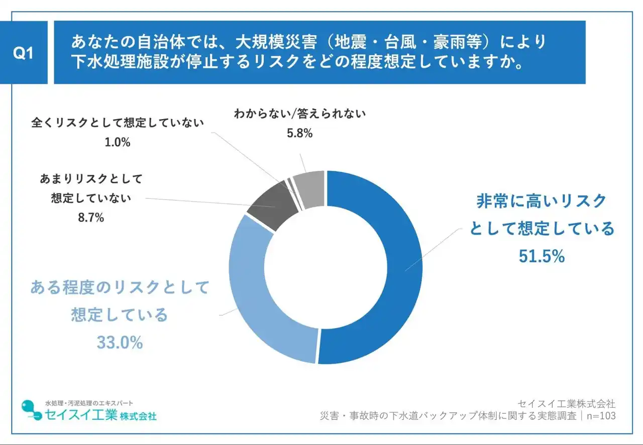 セイスイ工業は2025年、全国の自治体で下水道業務に携わる職員を対象に、「下水道インフラ老朽化対策に関する実態調査」「災害・事故時の下水道バックアップ体制に関する実態調査」の2つのインターネット調査を実施しました。前者は下水道インフラの老朽化対策の進捗状況を、後者は災害や事故時のバックアップ体制の整備状況を把握することを目的とし、それぞれ約100名の自治体職員から回答を得ました。 |