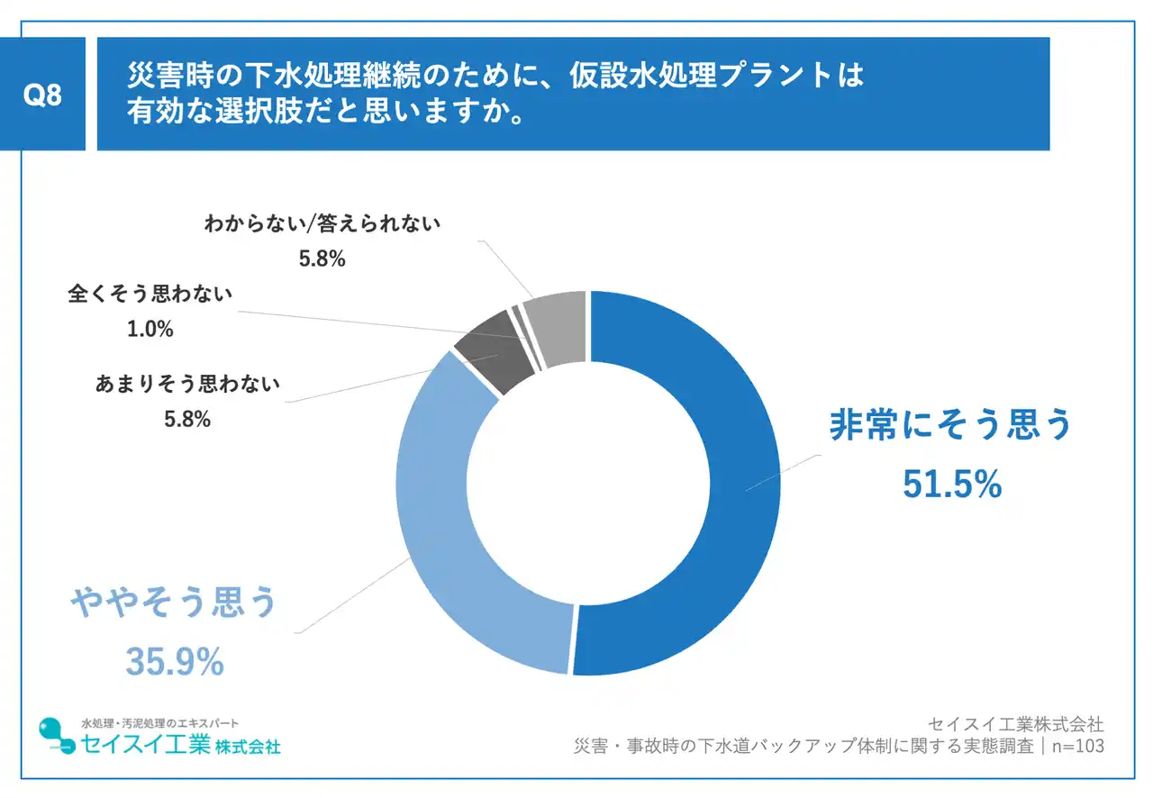 そのようななか、仮設水処理プラントの活用については高い関心が示されました。「災害時の下水処理機能停止に備える選択肢として有効だと思うか」という問いに、「非常にそう思う」が51.5%、「ややそう思う」が35.9%で、合計87.4%が肯定的に回答しました。 |