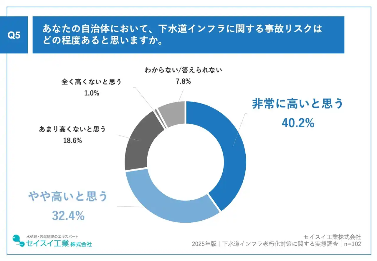 今後の下水道インフラの事故リスクについて、「非常に高い」と答えた人が40.2%、「やや高い」が32.4%で、合計72.6%が「高い」と認識していました。 |