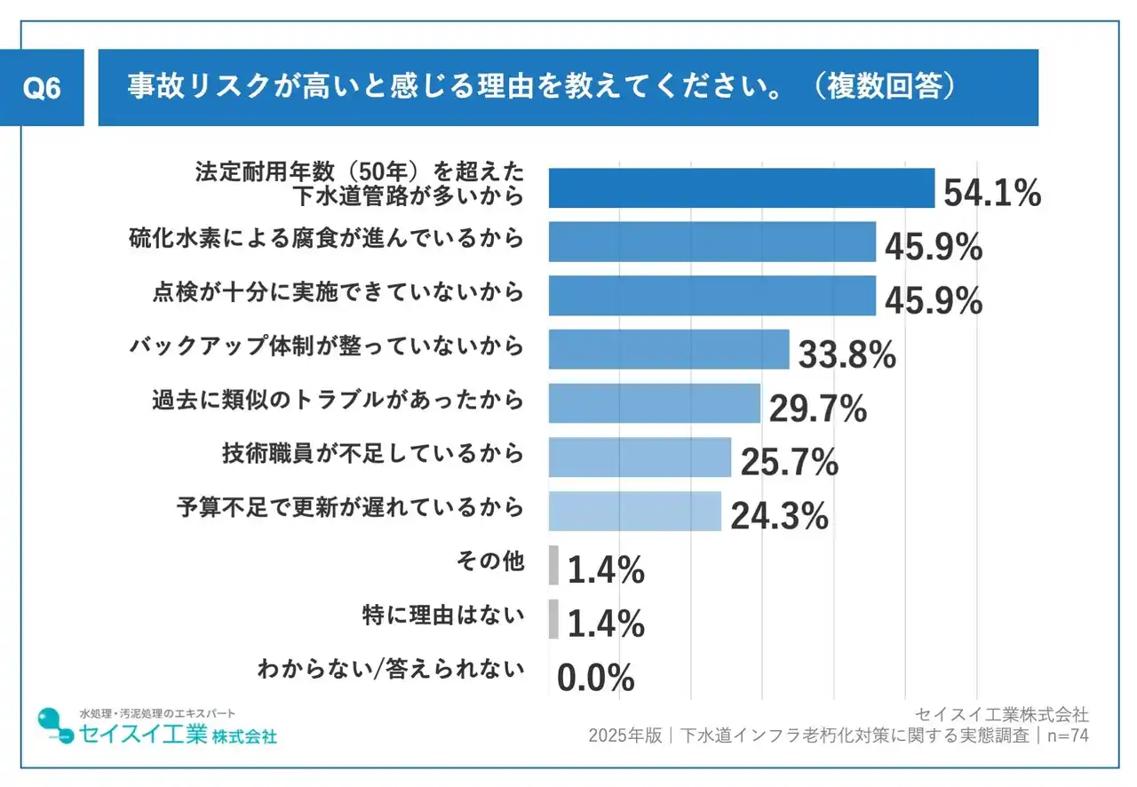 理由として「法定耐用年数(50年)を超えた下水道管が多い」(54.1%)、「老朽化による劣化箇所が増えている」(45.9%)、「バックアップ体制が十分でない」(33.8%)などが挙げられました。 |