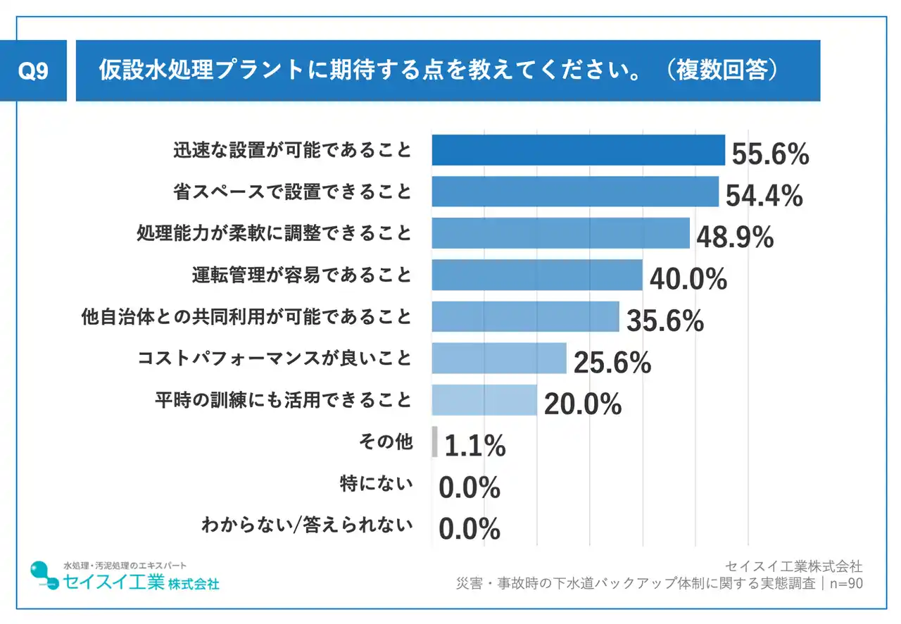 これらの結果から、多くの自治体がリスクの高さを認識しながらも、恒久設備だけでバックアップ体制を整備することには限界を感じている一方、仮設水処理プラントのような柔軟な選択肢には大きな期待を寄せていることが分かります。 |