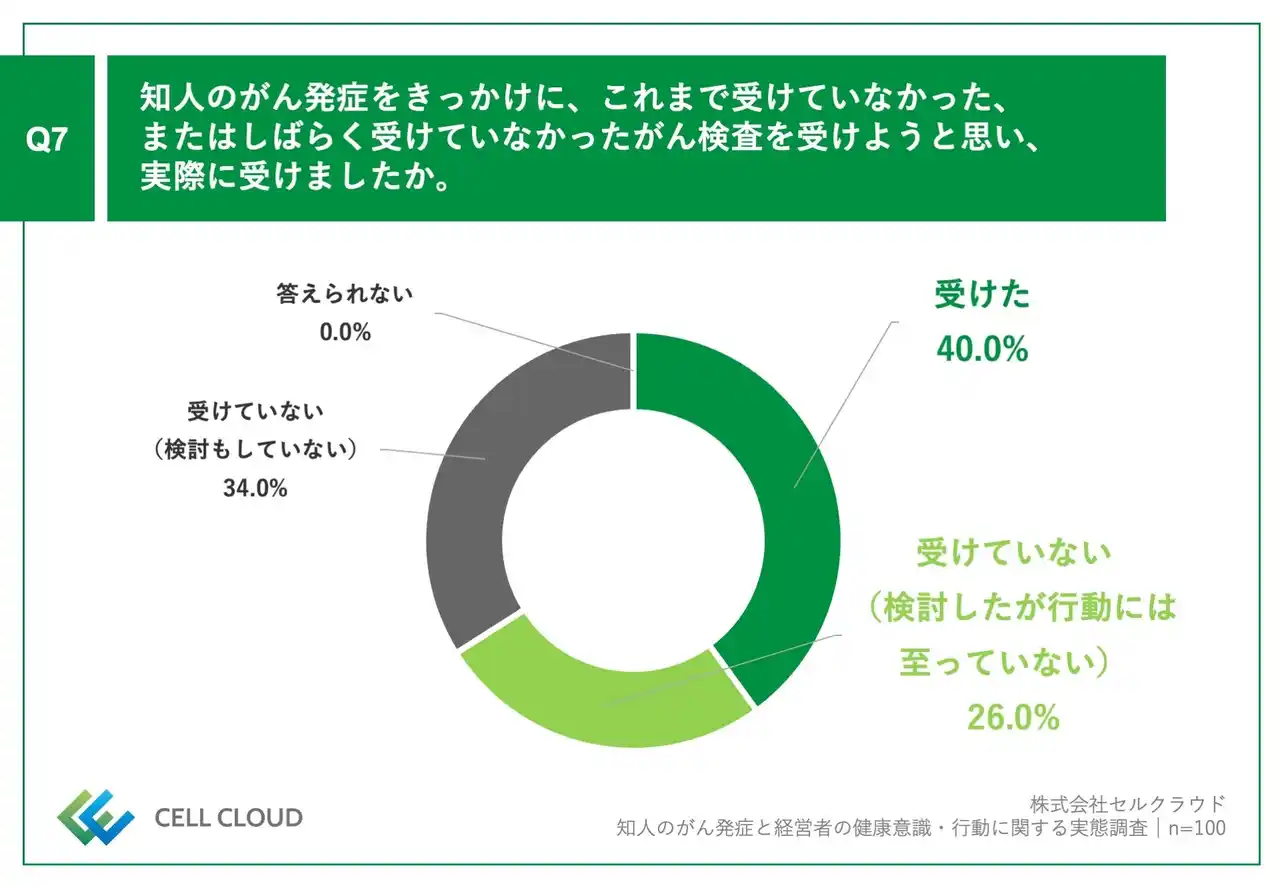 「Q7.知人のがん発症をきっかけに、これまで受けていなかった、またはしばらく受けていなかったがん検査を受けようと思い、実際に受けましたか。」(n=100)と質問したところ、「受けた」が40.0%、「受けていない(検討したが行動には至っていない)」が26.0%という回答となりました。 |