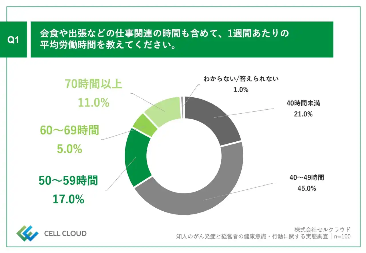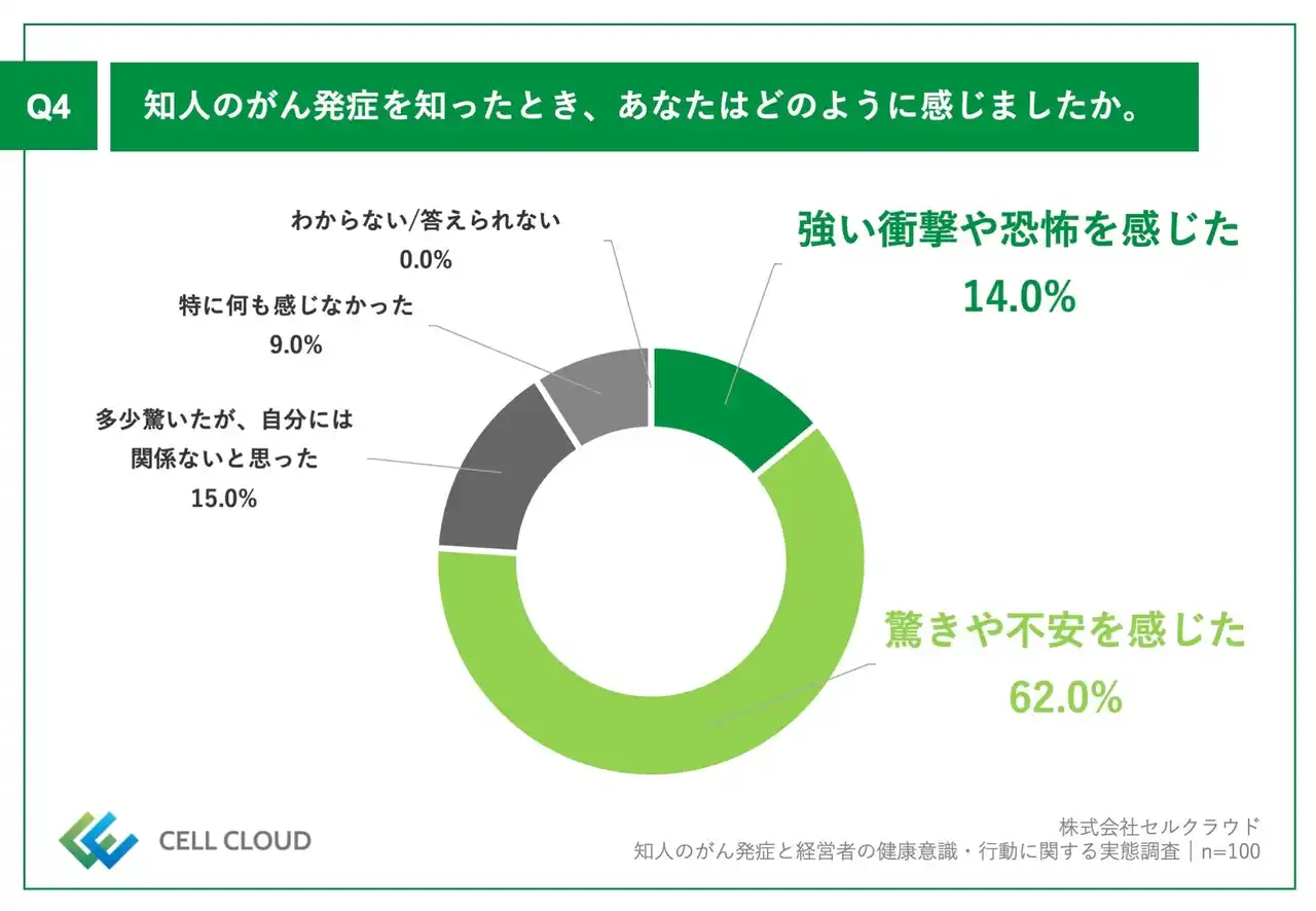 株式会社セルクラウド(本社:東京都渋谷区、代表取締役社長:濱野斗百礼、以下セルクラウド)は、直近1年以内に知人のがん発症を経験した、40歳以上の男性経営層(経営者・役員)100名を対象に、知人のがん発症と経営者の健康意識・行動に関する実態調査を実施しましたので、お知らせいたします。