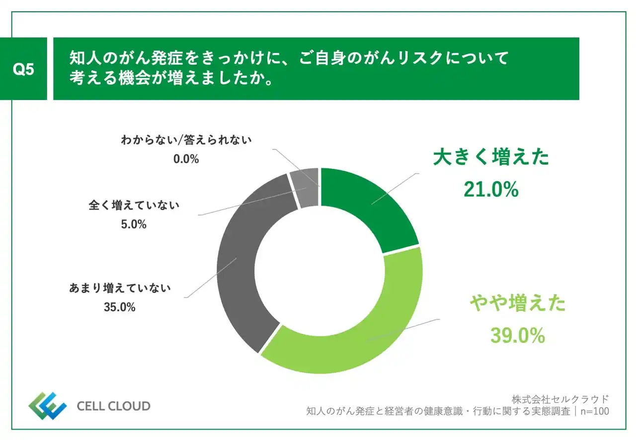 「Q5.知人のがん発症をきっかけに、ご自身のがんリスクについて考える機会が増えましたか。」(n=100)と質問したところ、「大きく増えた」が21.0%、「やや増えた」が39.0%という回答となりました。 |
