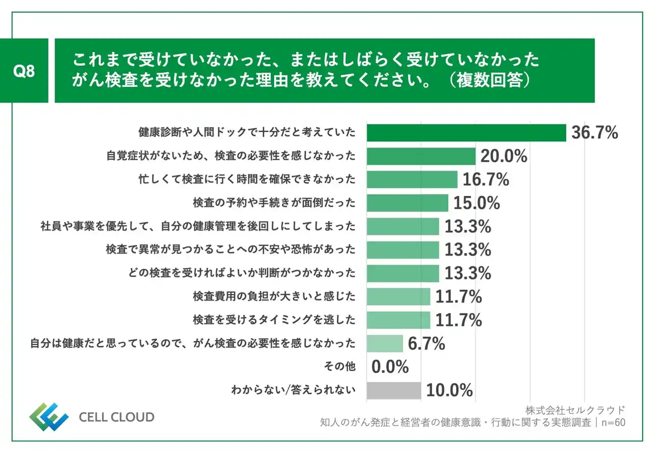 Q7で「受けていない(検討したが行動には至っていない)」「受けていない(検討もしていない)」と回答した方に、「Q8.これまで受けていなかった、またはしばらく受けていなかったがん検査を受けなかった理由を教えてください。(複数回答)」(n=60)と質問したところ、「健康診断や人間ドックで十分だと考えていた」が36.7%、「自覚症状がないため、検査の必要性を感じなかった」が20.0%、「忙しくて検査に行く時間を確保できなかった」が16.7%という回答となりました。 |