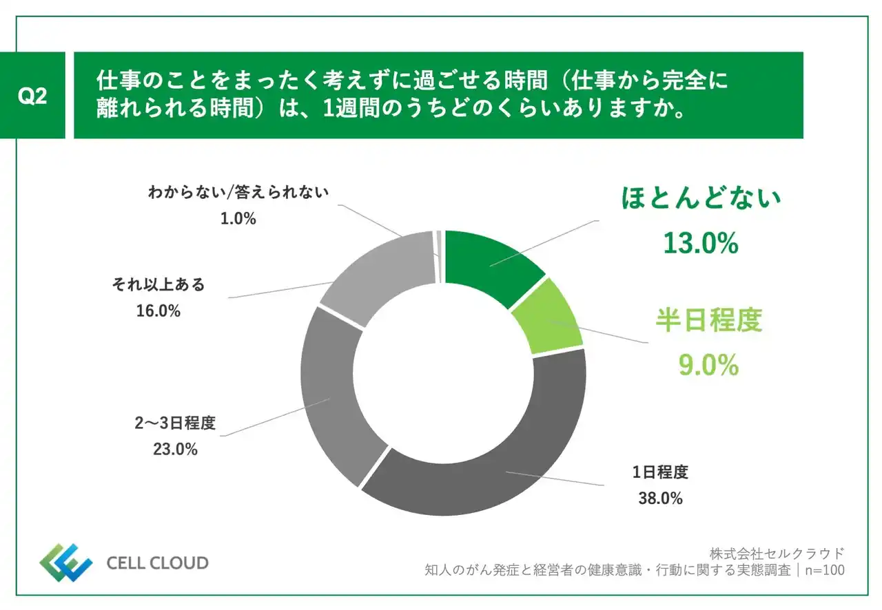 「Q2.仕事のことをまったく考えずに過ごせる時間(仕事から完全に離れられる時間)は、1週間のうちどのくらいありますか。」(n=100)と質問したところ、「ほとんどない」が13.0%、「半日程度」が9.0%という回答となりました。 |