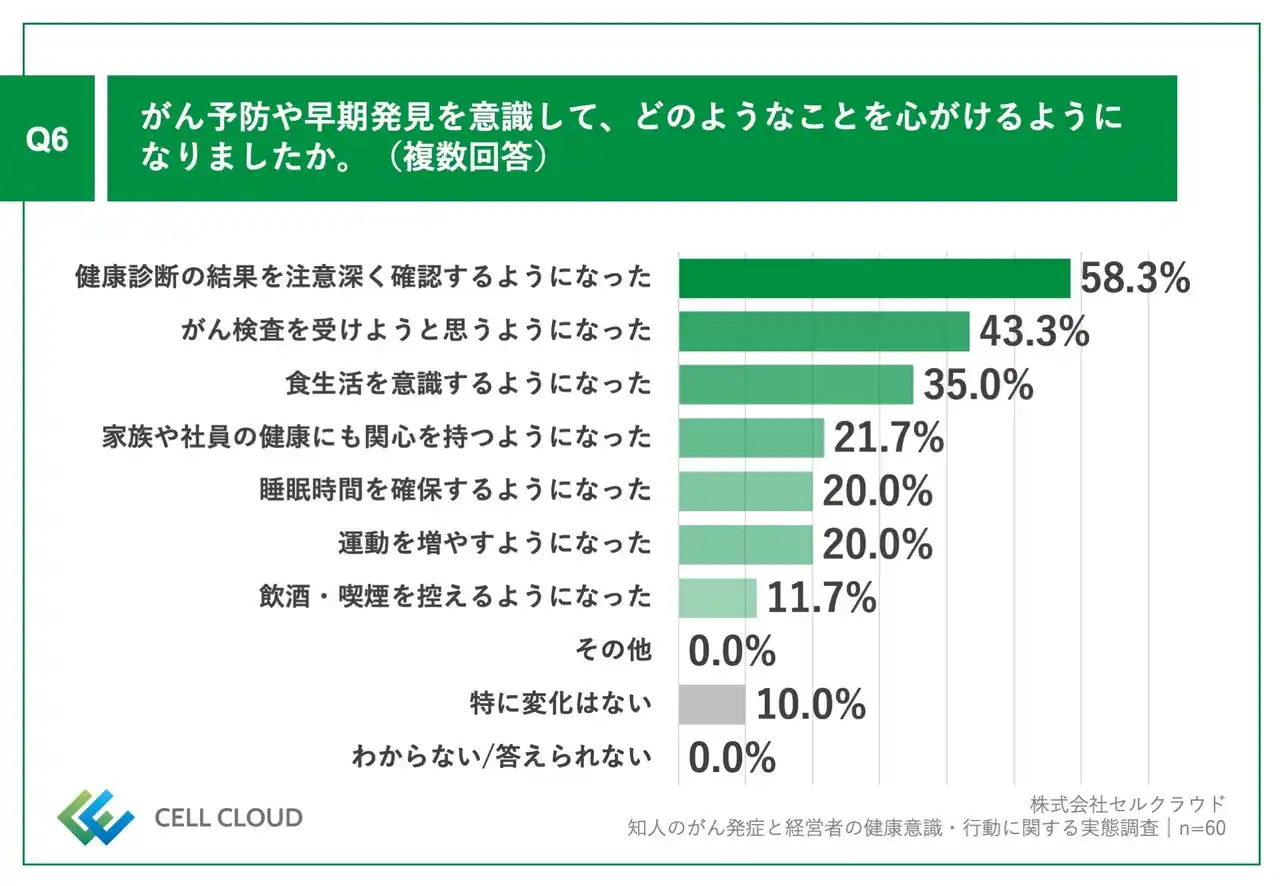 Q5で「大きく増えた」「やや増えた」と回答した方に、「Q6.がん予防や早期発見を意識して、どのようなことを心がけるようになりましたか。(複数回答)」(n=60)と質問したところ、「健康診断の結果を注意深く確認するようになった」が58.3%、「がん検査を受けようと思うようになった」が43.3%、「食生活を意識するようになった」が35.0%という回答となりました。 |