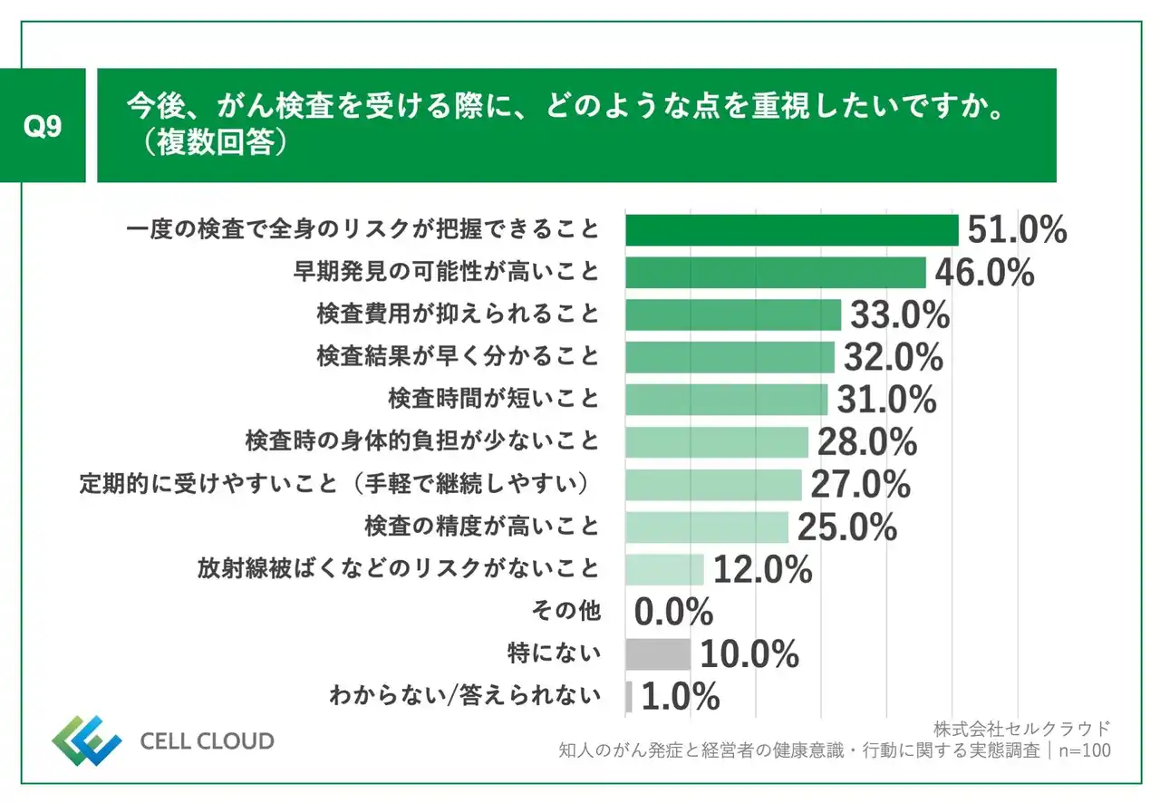 「Q9.今後、がん検査を受ける際に、どのような点を重視したいですか。(複数回答)」(n=100)と質問したところ、「一度の検査で全身のリスクが把握できること」が51.0%、「早期発見の可能性が高いこと」が46.0%、「検査費用が抑えられること」が33.0%という回答となりました。 |