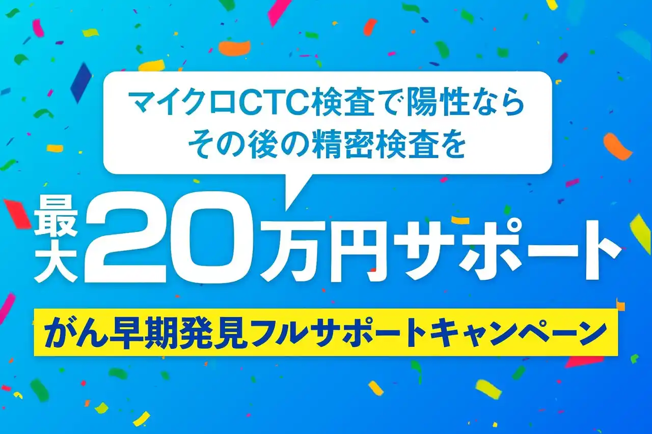 セルクラウドは、たった1回の採血だけで全身のがん※2リスクを発見できる『マイクロCTC検査』を提供しています。現在、当検査を受けて陽性判定を受けた方を対象に、先着1,000名様限定で、その後の精密検査費用を最大20万円までサポートするキャンペーンを実施中です。 |
