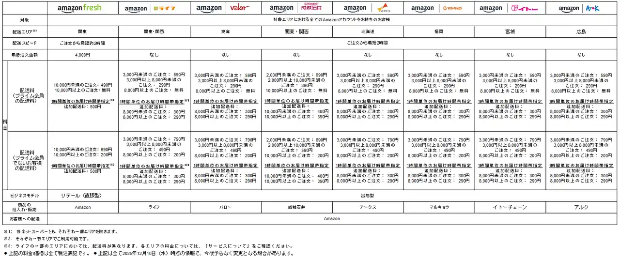 Amazonは、Amazon上のアルクネットスーパーに加えて、東京・神奈川・千葉・埼玉の一部エリアにおいて「Amazonフレッシュ」(www.amazon.co.jp/fresh)を、食品スーパーライフとの協業により、東京・神奈川・埼玉・千葉・大阪・京都・兵庫の一部エリアにおいてライフネットスーパー(www.amazon.co.jp/life)を、スーパーマーケットバローとの協業により、愛知・岐阜の一部エリアにおいてバローネットスーパー(www.amazon.co.jp/valor)を、スーパーマーケット成城石井との協業により、東京・神奈川・愛知の一部エリアにおいて成城石井ネットスーパー(www.amazon.co.jp/seijoishii)を、アークスとの協業により、北海道の一部エリアにおいてアークスネットスーパー(www.amazon.co.jp/arcs)、マルキョウとの協業により、福岡市とその周辺の一部エリアにおいてマルキョウネットスーパー(www.amazon.co.jp/marukyo)を、イトーチェーンとの協業により、仙台市と周辺の一部エリアにおいてイトーチェーンネットスーパー(www.amazon.co.jp/itochain)をAmazon上でそれぞれ展開しています。対象エリアのAmazon.co.jpアカウントをお持ちの全てのお客様は、追加の登録手続きや会費無しでAmazon.co.jp(Webサイト、Amazonショッピングアプリ)上で各ネットスーパーをご利用いただけます。今後も日々の生活に欠かせない食料品や日用品をお得な価格でご提供するとともに、配送エリアの順次拡大を続けてまいります。 |
