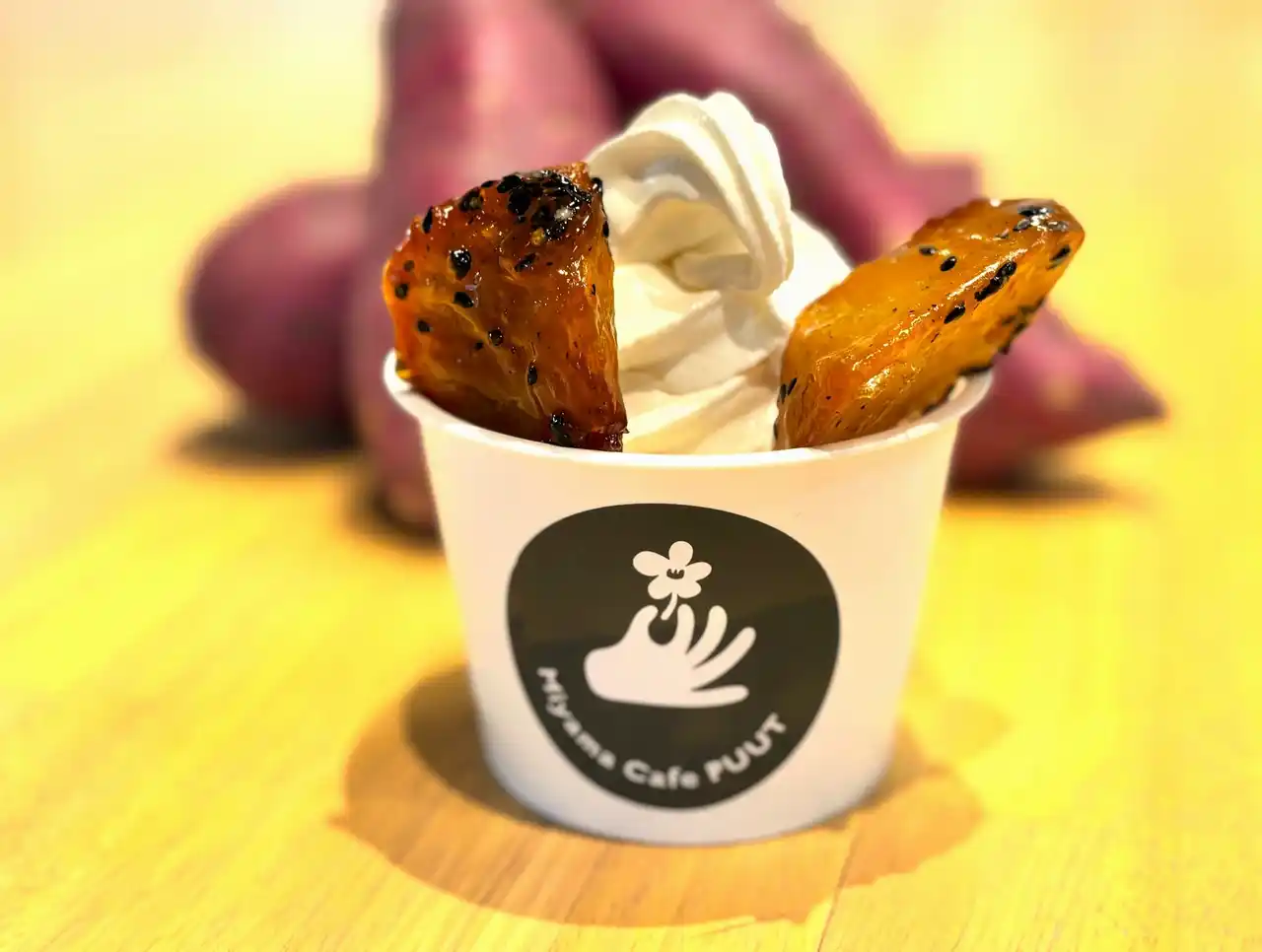 甘い大学芋を贅沢に乗せ、冷たいソフトクリームと温かい大学芋の絶妙なコントラストが楽しめます。 |