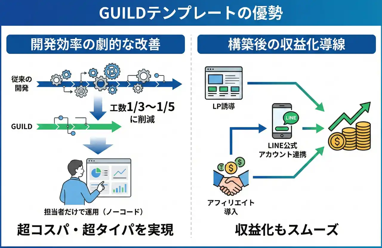 | 資料内に示されている通り、GUILDのテンプレートは開発工数を1/3~1/5に削減し、担当者だけで運用できる構造により“超コスパ・超タイパ”を実現します。 | |||||||||
