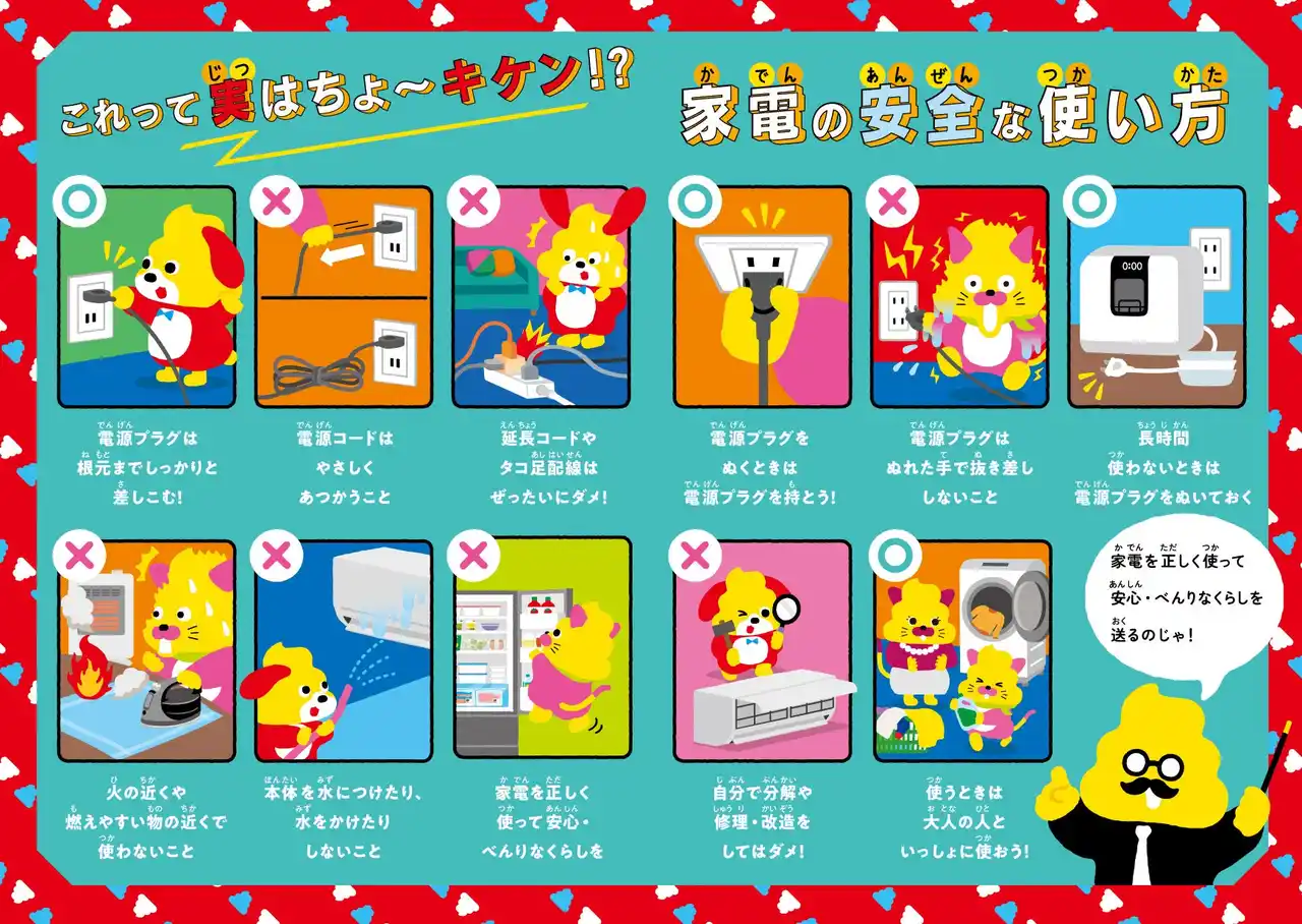 最後のページでは、「これって実はちょ~キケン!?」をテーマに、家電を安全に使うためのポイントをうんこ先生たちが徹底チェック!ユーモアあふれるイラストの中に、実は大切なヒントがたくさん。電源プラグの扱い方、水まわりや火のそばでの注意など、日常の中に潜む“あぶない!”を楽しく学べる構成です。 |