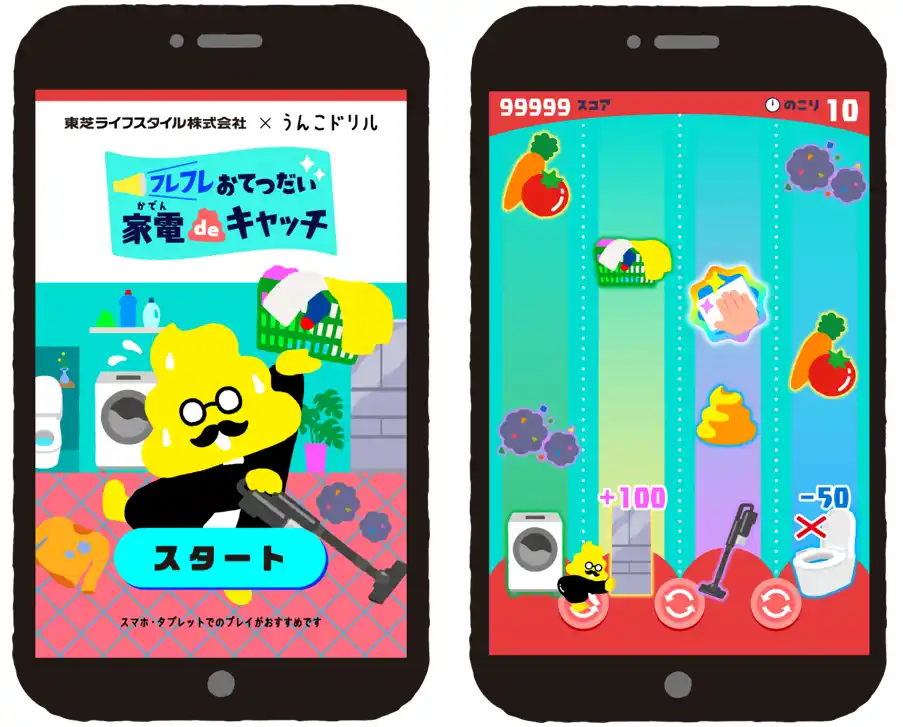 プレイヤーは、洗濯機・冷蔵庫・掃除機・トイレを操作し、画面上から落ちてくる「洗濯物」「野菜」「ホコリ」「うんこ」を正しい家電でキャッチします。正解するとスコアアップ!遊びながら家電の役割や正しい使い方を自然と学べる構成になっています。 |