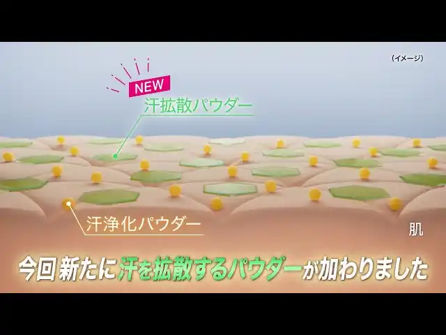 今回の改良で、「持続型パウダーヴェール」が、新たに「持続型パウダーヴェールEX」へと進化しました。このヴェールを構成する主成分は、従来から配合している「汗浄化パウダー」と、新たに採用した「汗拡散パウダー」です。新配合の「汗拡散パウダー」が、汗が出た瞬間に汗を肌全体に広げて、汗の蒸散を促進します。さらに「汗浄化パウダー」が汗を吸い込み、ベタつきの原因成分をキャッチして、乾きやすい汗に変化させます。 |