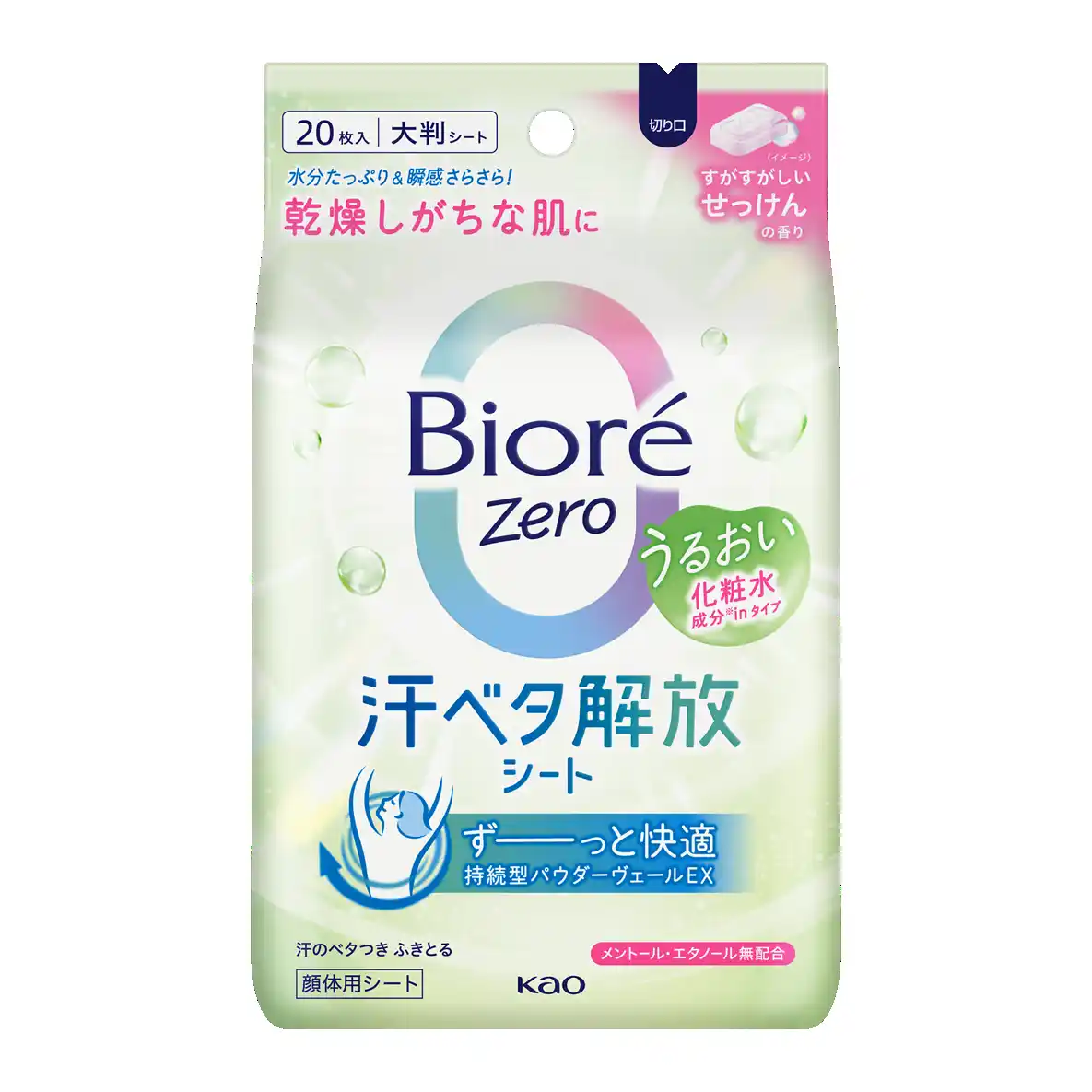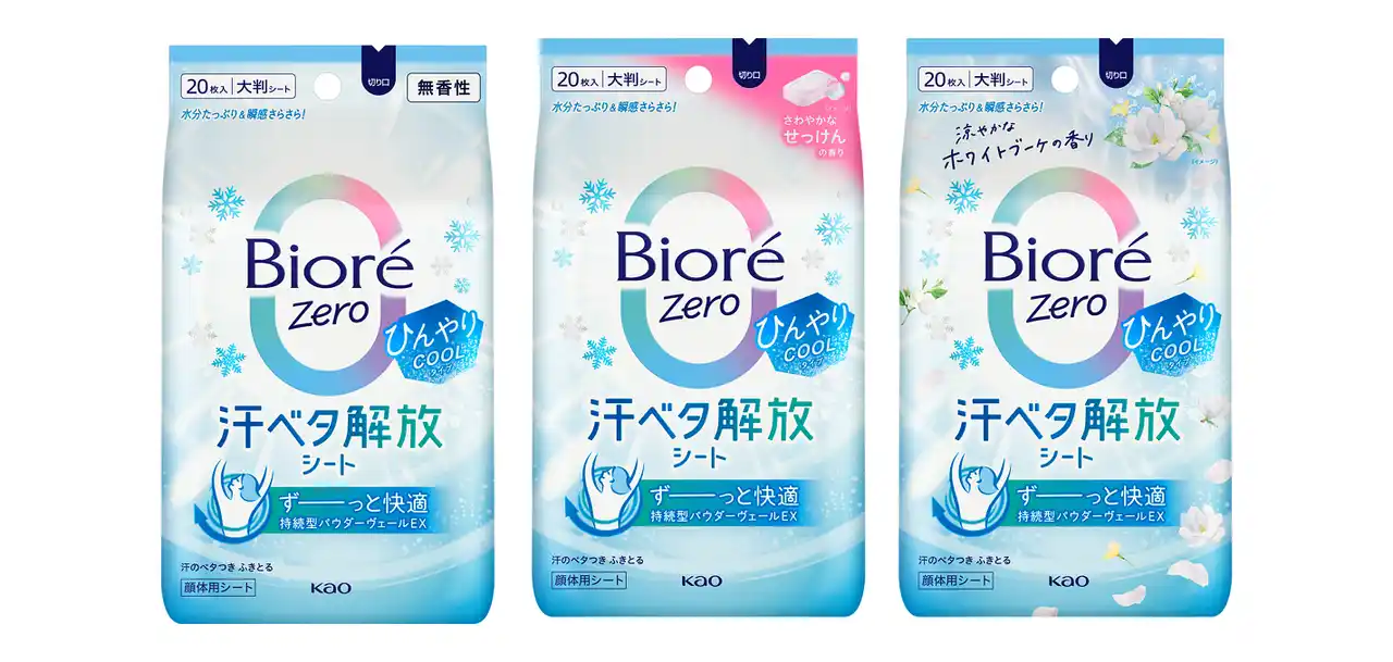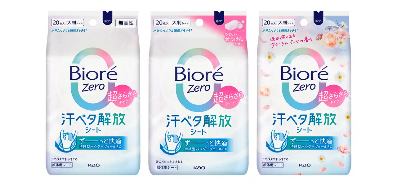 「ビオレZero」は、近年の気候変動がもたらす高温多湿な環境による、生活者の抱える湿度・温度ストレス*1に着目し、2024年3月に誕生しました。主力アイテムである『ビオレZero シート』は、汗を乾かし続けることで長時間快適な状態が持続する価値提案で、累計出荷数量1,400万個*2を突破。ご使用いただいた方からは、「さらさら感が続くから、服が肌にはりつかずにうれしい」「使った後は、肌がベタつかずに快適」など、多くの好評の声をいただいております。“快適さを肌の上にまとう”アウタースキン発想に基づく「ビオレ」のプロテクション提案が、多くのお客さまから高い支持をいただき、汗ふきシート市場で売上No.1*3を獲得しています。 |