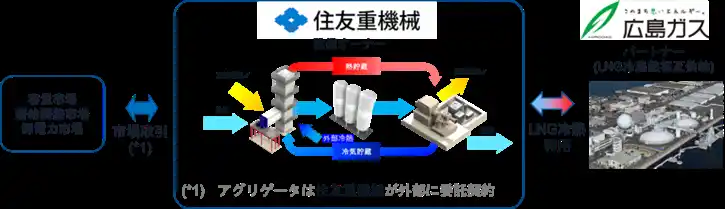 本設備は液化空気生成過程において、LNG冷熱供給により充電効率の向上を図る、世界初のLAES商用プラントです。住友重機械は、本設備の設計、建設、運転および運用を担い、商用運転を通して得られる知見を基に設備の合理化を図ります。広島ガスは、LNG冷熱の供給を担い、自社設備内ボイラの省エネ・省CO2など、LNG冷熱の有効利用を図ります。 |