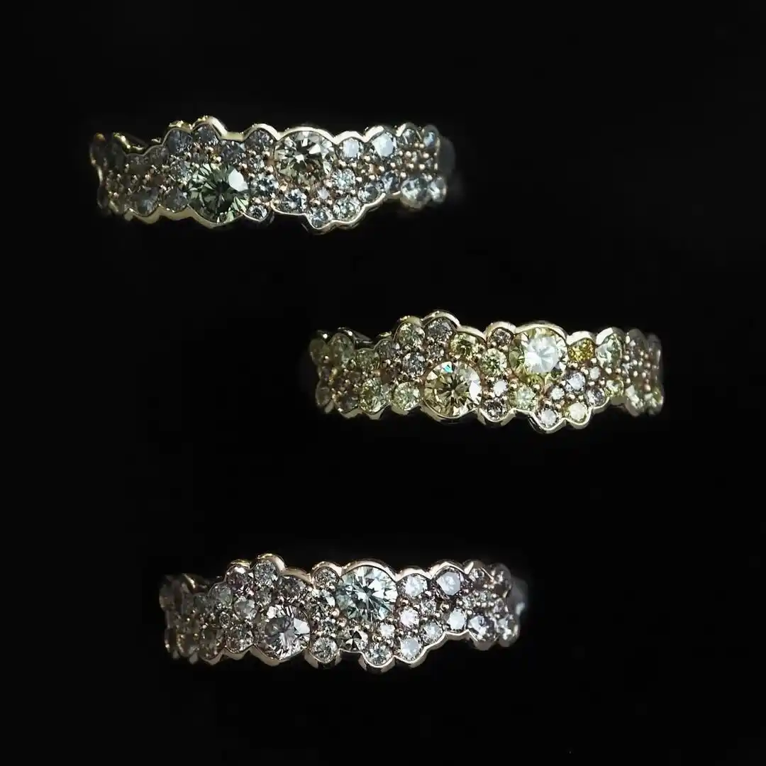2.5mm~3.8mmサイズのダイヤモンドを贅沢にあしらった3種類の新作リングです。 肌に自然に溶け込むような上質なニュアンスを持つシャンパンカラーのダイヤモンドを中心に、デザイナーの成澤が一つずつ石を選び、繊細な濃淡をつけた配色に仕立てています。 |