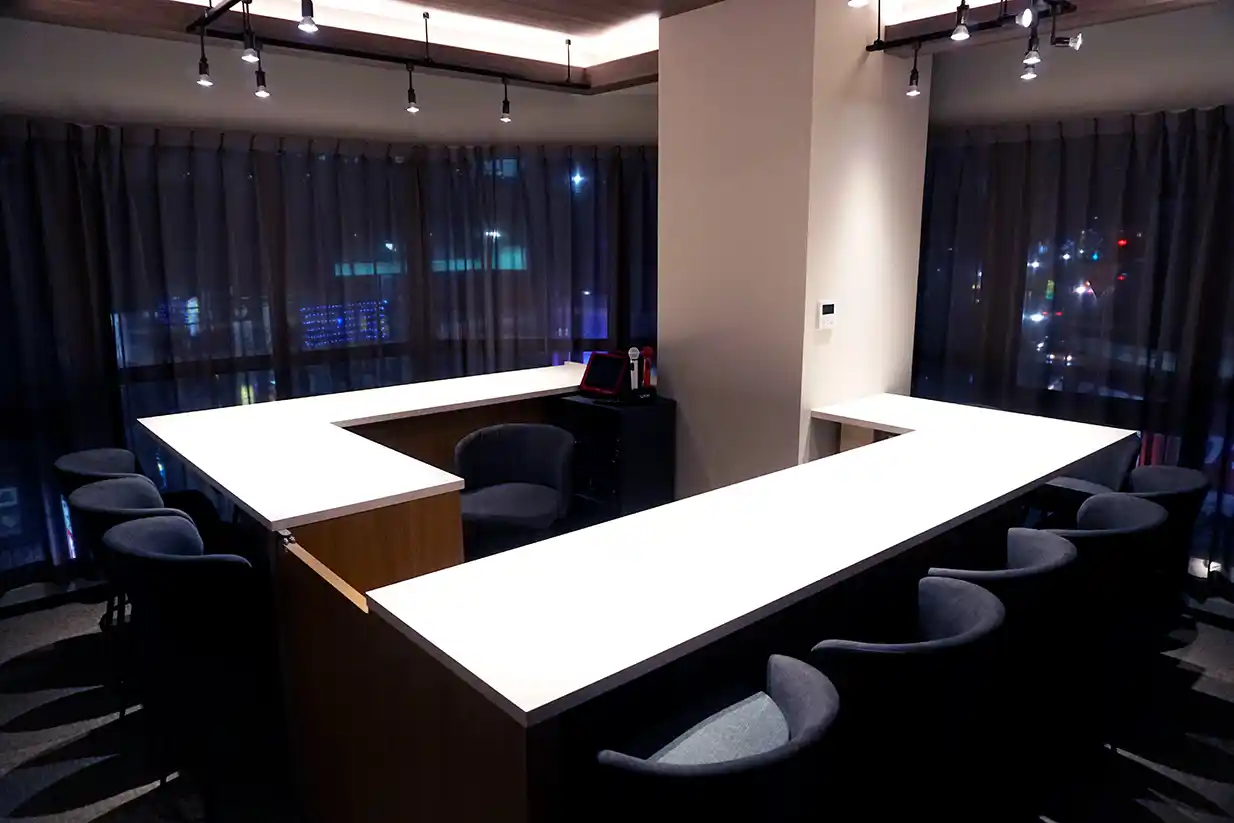 アーバンシックなカウンターテーブルで、空間の美しさとROOM6ならではの個性的かつ統一感のある世界をご堪能ください。趣きが異なる6つの部屋は、自由に移動できる“パブリック”が2部屋、仲間内でのご利用に最適な“VIP”が4部屋ございます。