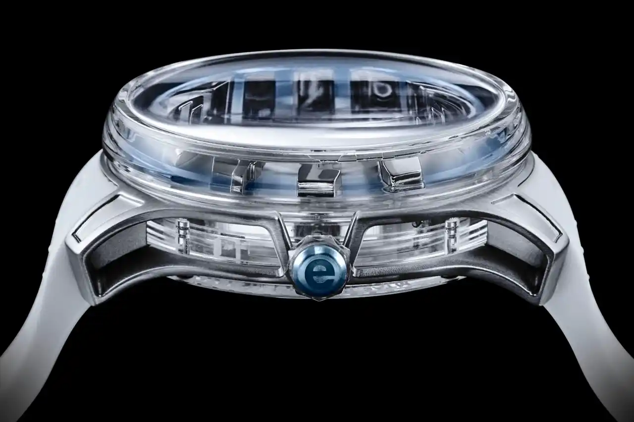 K9クリスタルで全周を覆ったフルスケルトン仕様で、一部がくり抜かれたステンレス製ケースの側面や背面からも、完成されたムーブメントの美しさを鑑賞できます。 |