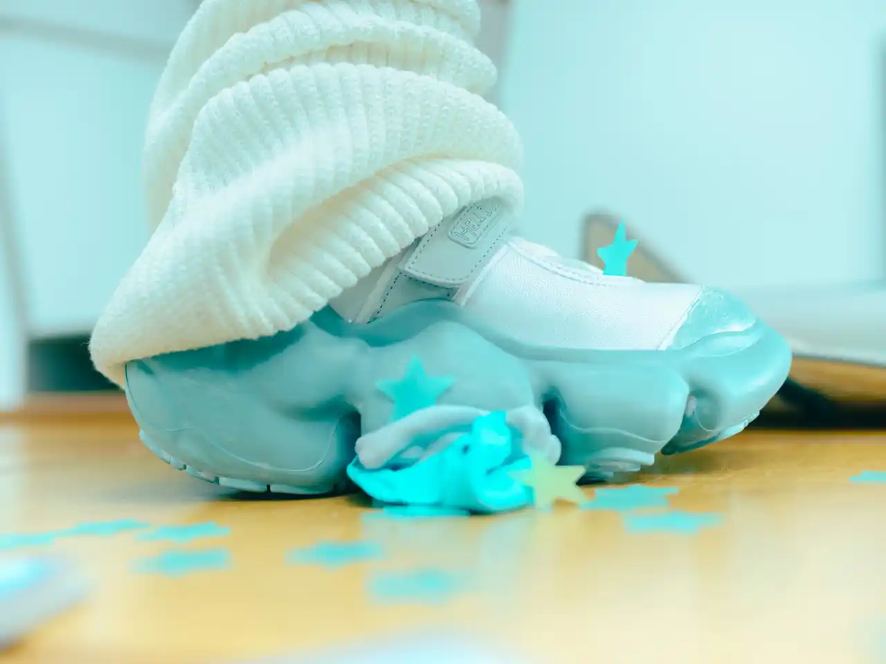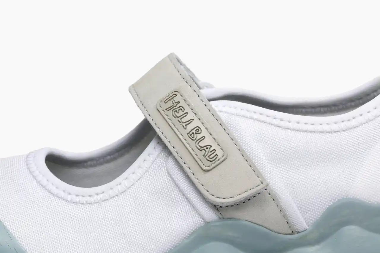 ソールにはHELL BLAUの象徴である水色を取り入れ、あのが特に好んでいるブルー×グレーの色味を調色して使用しました。手塗り風のデザインがポイントで、アウトソール部分にはガムを踏んづけたような遊び心のあるデザインが施されています。「上履き感」がありつつも日常使いができるファッションアイテムとして、HELL BLAUらしいユニークさが感じられる一足に仕上げました。 |