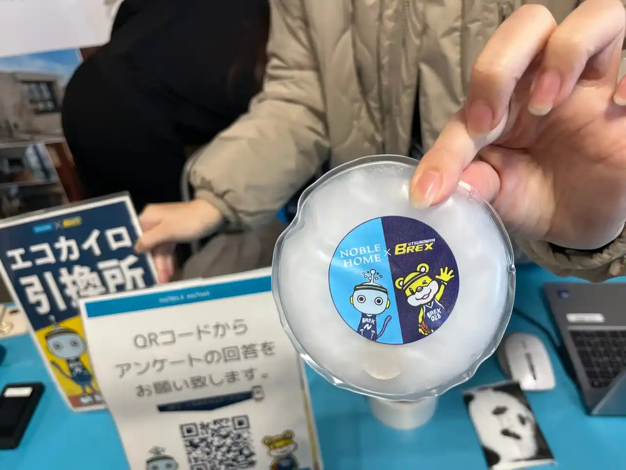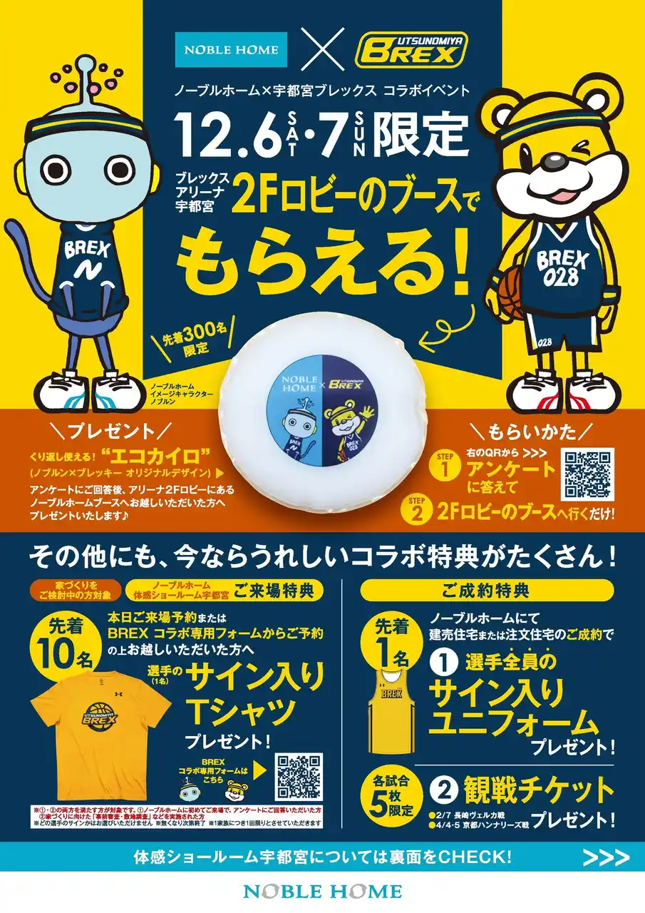 ブースでは、配布チラシのアンケートにご回答を頂いた皆様に、ノーブルホームのイメージキャラクター【ノブルン】と、宇都宮ブレックスのイメージキャラクター【ブレッキー】のコラボエコカイロがプレゼントされ、ファンの皆さまにはとても喜んでいただけました。 |