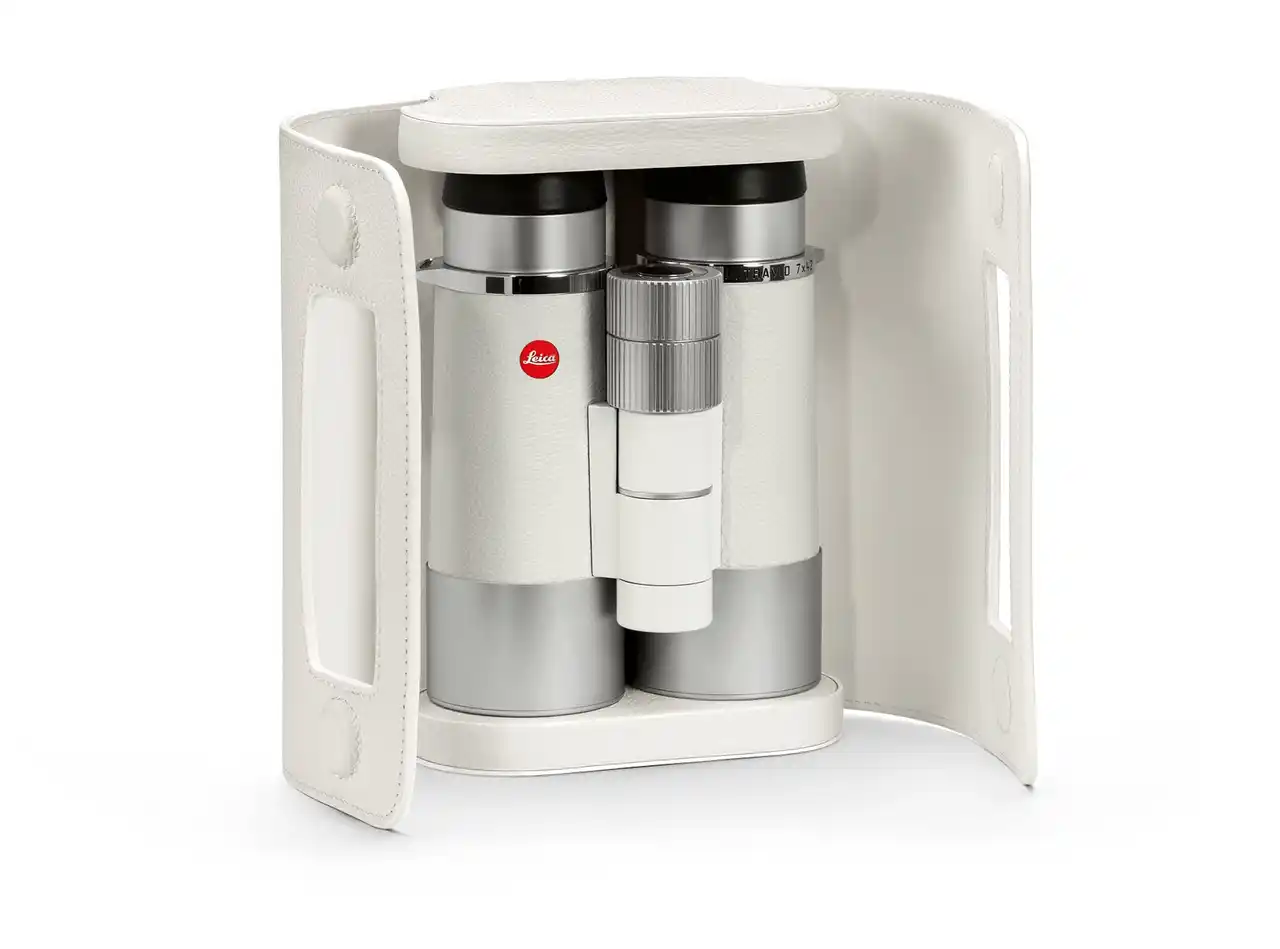 「ライカ ウルトラビット ホワイトオーシャン 7x42」にあわせて上質なポーチやストラップなどのアクセサリーも展開されます。これらの専用アクセサリーも双眼鏡本体と同様に特別なデザインで双眼鏡本体にマッチするカラーリングも揃えています。ポーチは、ラッピングクロスのように双眼鏡本体を包み込んでマグネットで留める仕組みになっており、双眼鏡本体をしっかりと保護できます。また、船上などでチーク材やラッカー塗料を使用したすべりやすい表面に置いても安心です。 |