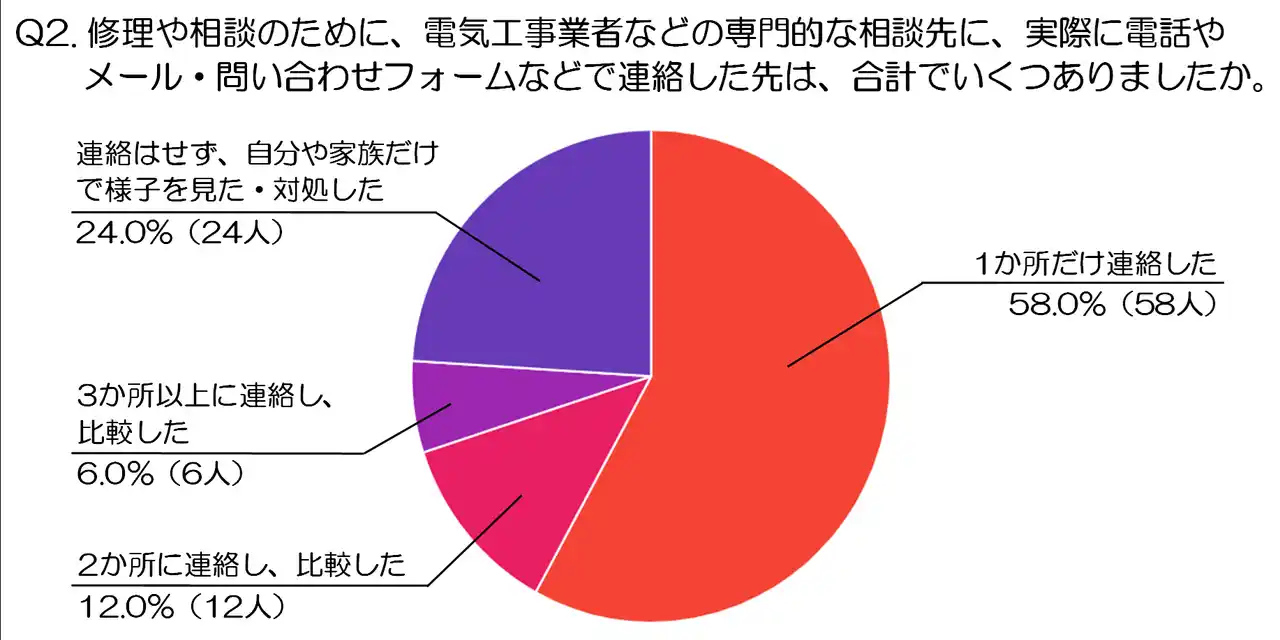 最も多かったのは「1か所だけ連絡した」という回答で、58.0%(58人)に達しました。急なトラブルの場面では、深く比較するよりも、まずは目についた業者や信頼できそうな窓口に絞って相談する人が多いと考えられます。電気関連の不具合は生活への影響が大きく、早く対処したいという心理が働きやすいのでしょう。 |